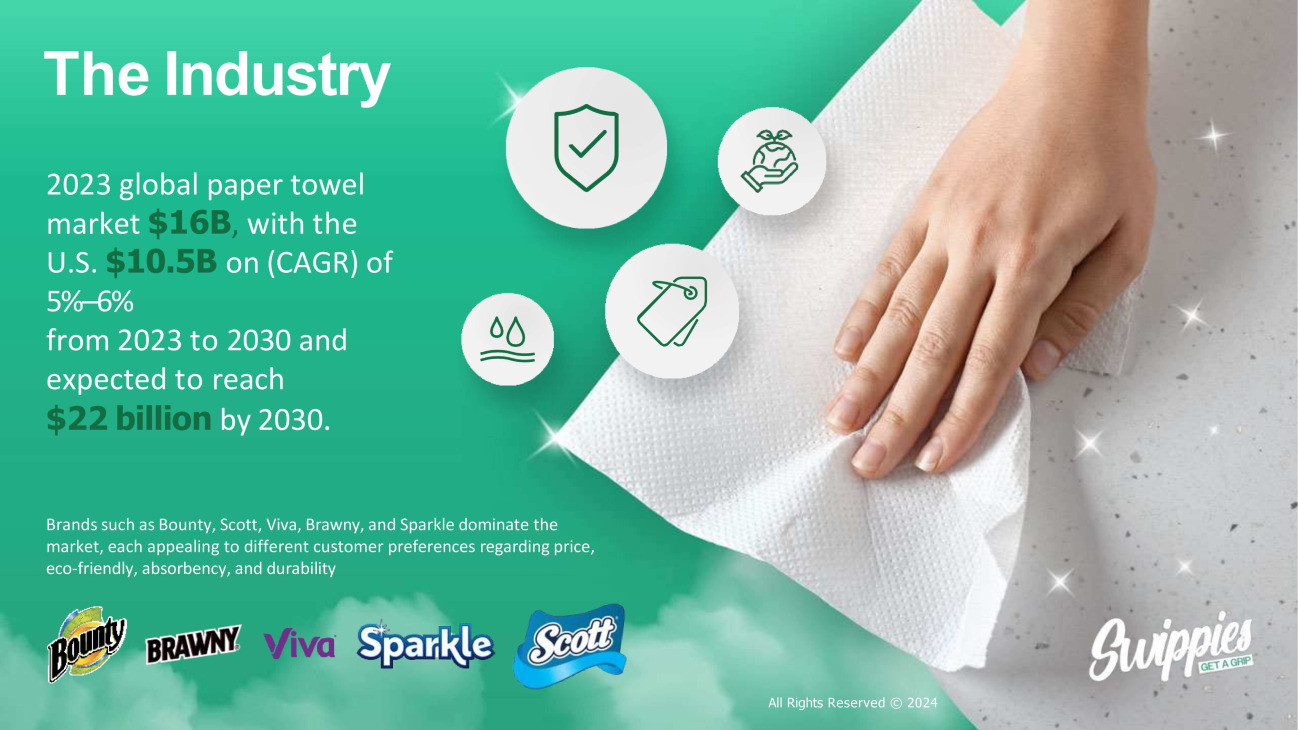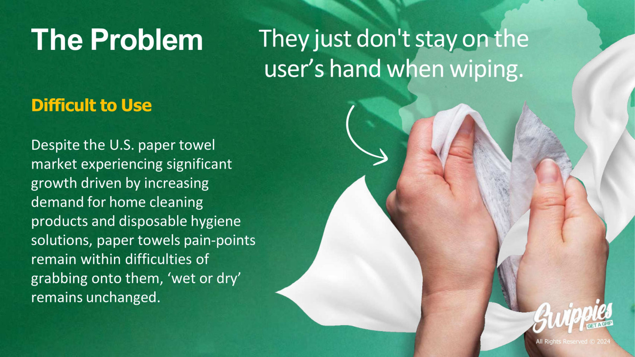 At Swippies, we’re creating a disruptive business within the $10.5 Billion dollar paper towels market in America, $16 Billion globally, to grow to $22 Billion by 2030 with sustainability and user-friendliness at the forefront.